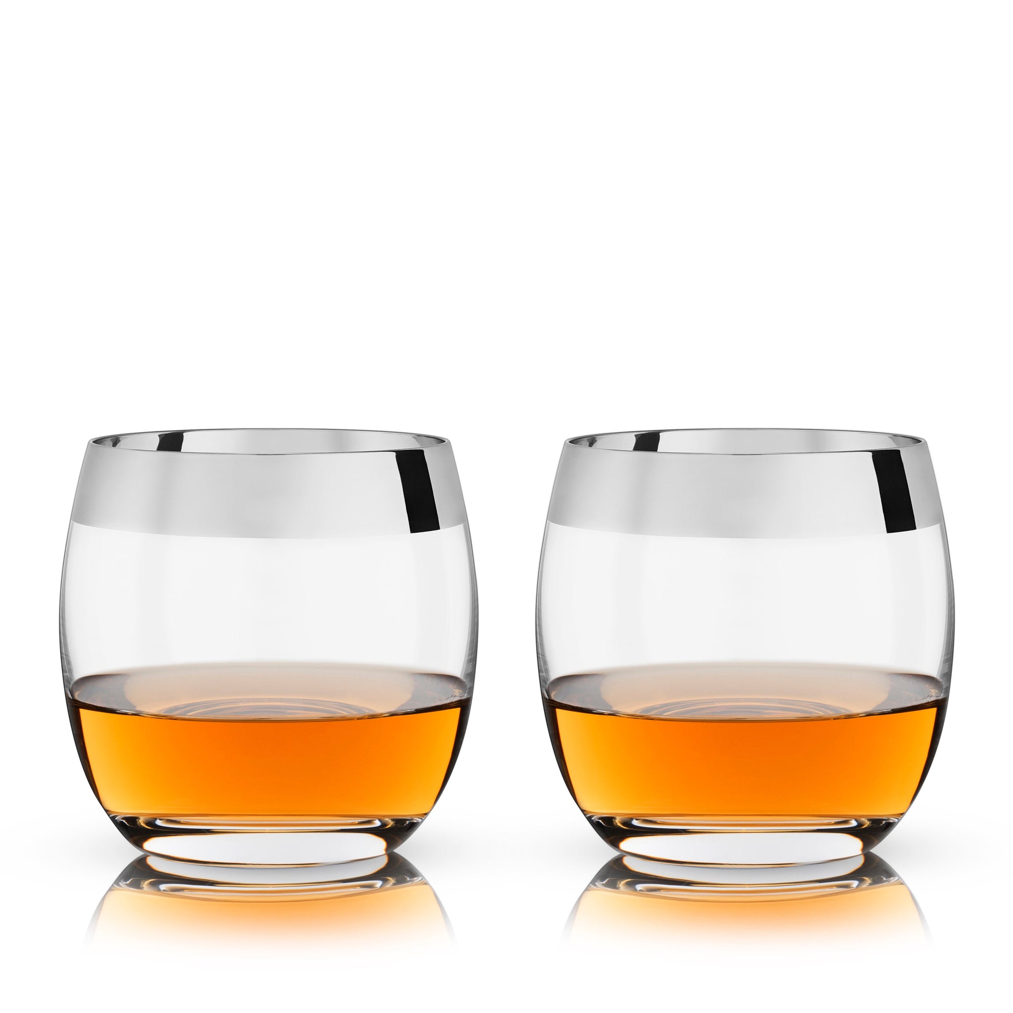 This pair of crystal tumblers resurrects the streamlined aesthetics of mid-century modern design, with sleek chrome-painted rims worthy of the corner office.