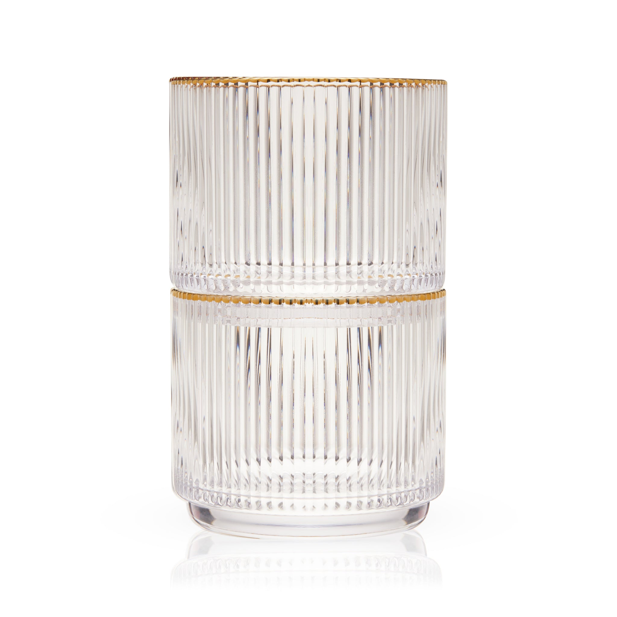 With stunning clarity and a rippled texture, this pair of stackable gold-rimmed tumblers are ideal for spirits on the rocks or lowball cocktails. The weighted base and rounded silhouette give each glass unique elegance that enhances your home bar or glassware collection.