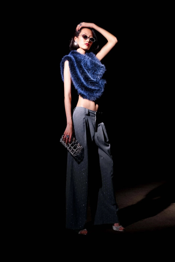 Wrap yourself in luxe texture with this midnight-navy faux fur top, designed in a draped cowl silhouette that brings instant drama to any evening look. Its plush hand feel and sculptural volume strike the perfect balance between modern statement and timeless glamour.
