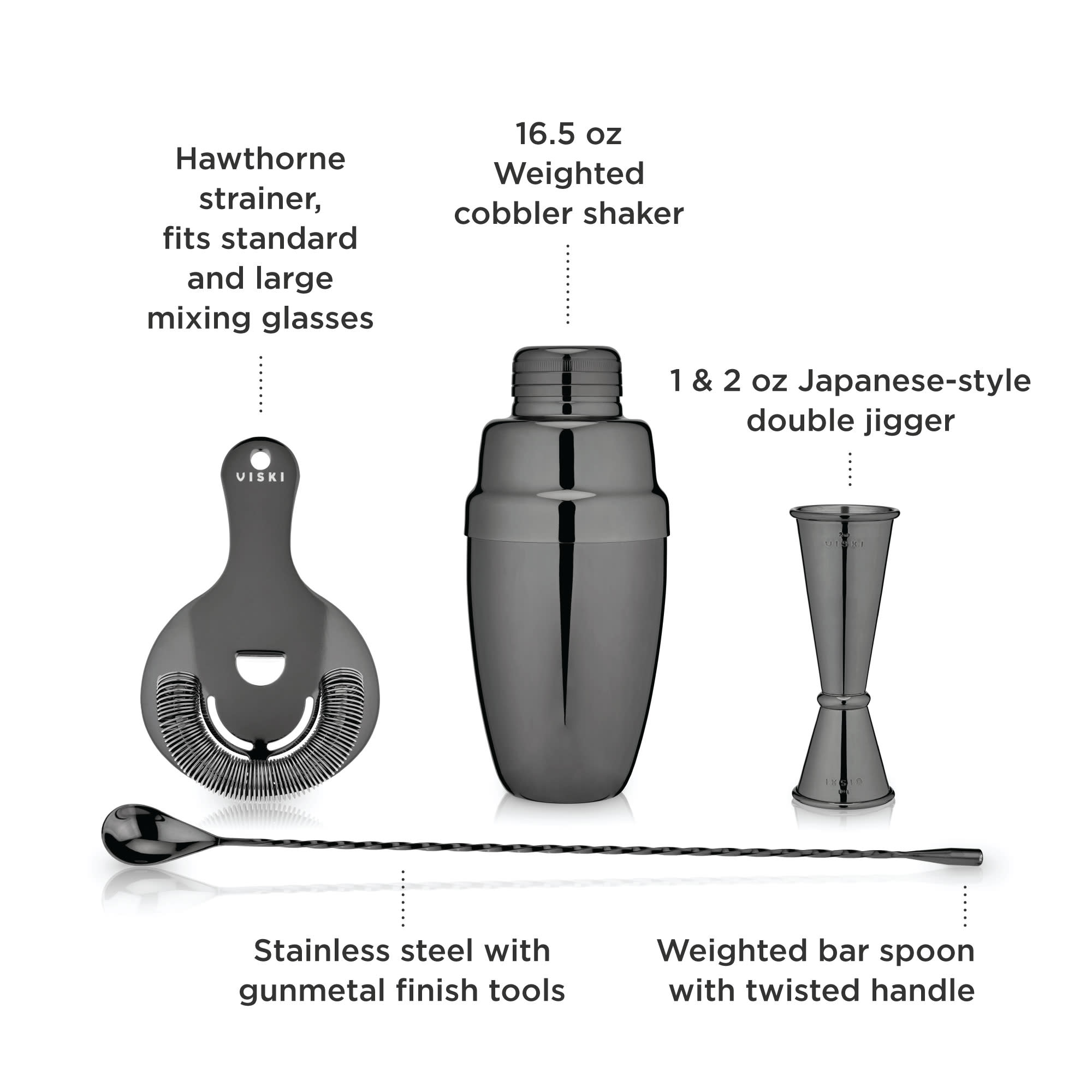 - Included: 1 16.5 oz. Heavyweight Cocktail Shaker, 1 Hawthorne Strainer, 1 Double-Sided Jigger with 1.5, 0.75 and 0.5 oz. measurements, 1 Weighted Bar spoon